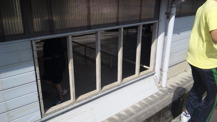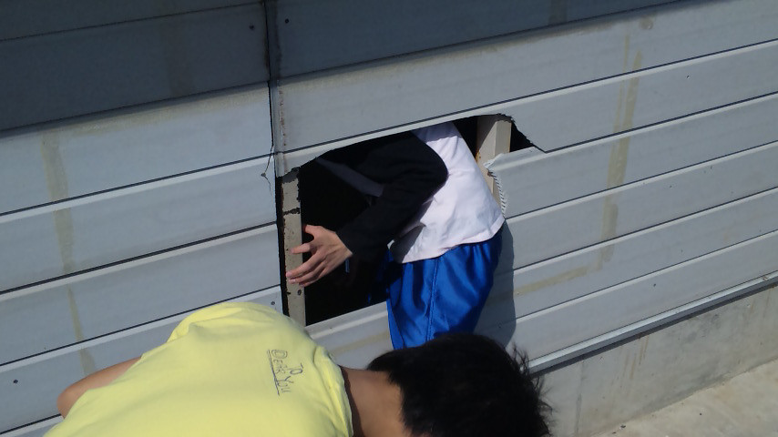 ぼーっとしてるといきなり友達からメールが…。 壁直すの手伝って~(ママ) 突然の意味不明なメールに戸惑いつつも、 言われたとおり学校に行くと…、 こんな大穴が…! なんでも冬にその「友達」が自転車小屋の壁蹴ったらしく、 雪が溶けるまで待ってたとのこと…。 で、先生も動員しつつまずは壁板をはずし…、 さぁ、いざ付けるとなるとこれがまた小難しい仕組みになってるもんで、 なかなか上手くはまってくれない…。 あんまりにもはまんないモンで、仕舞いには技術の先生登場…。 やっぱり専門にモノ作りやってるヒトは違いますねっ! 早いのなんの!! ボクらが2時間近くかかってダメだったのが ものの数分で解決…。 みごと元通り!! そのあとに「友達」からもらったキレートレモン120円が 今日の肉体労働2時間の報酬…。 120円÷2時間=60円/1時間…? 時給60円という破格のバイトでした。 (まぁヒマつぶしにはなったか?) 上の写真、よく見るとヒビが入ってるんですが、 それはボクがネジ穴あけるときに踏み壊しちゃったやつです…。 ごめんなさい。